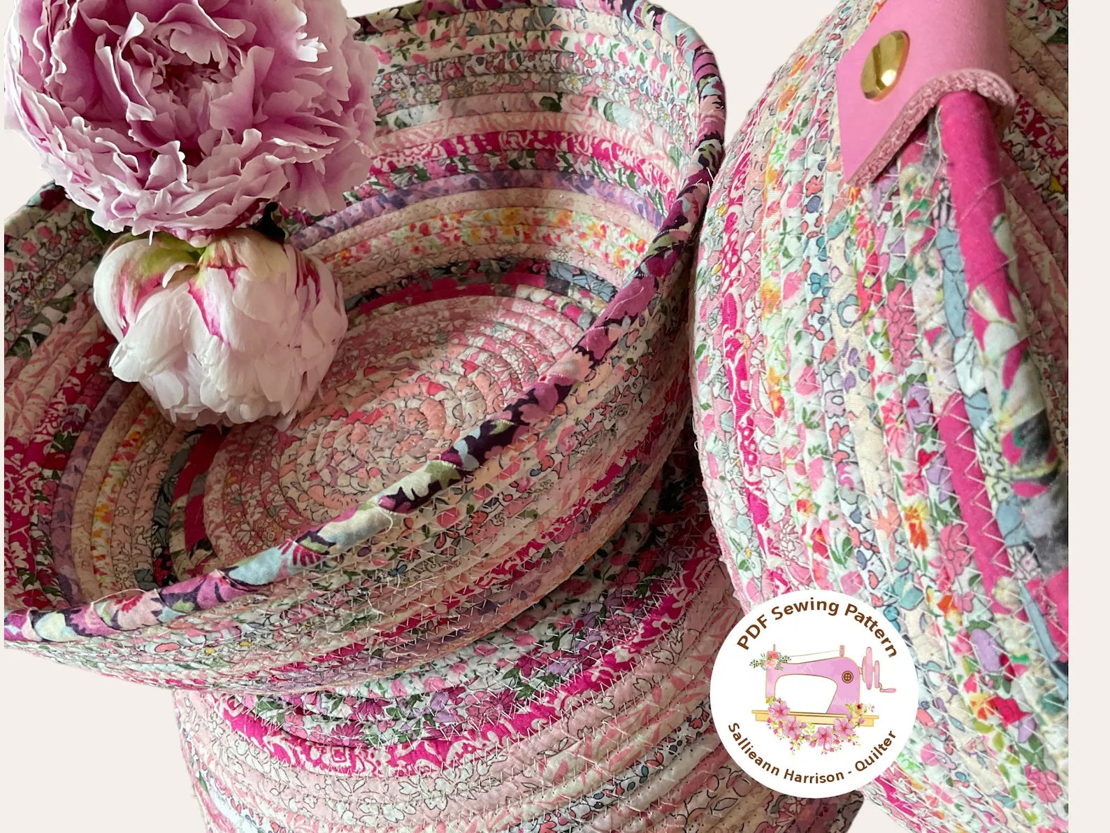 The pattern includes full size templates for you to print at home. The front of the bag features a specialist folded technique. The bag has a pleasing shape and supports itself well when placed down on its base (which have little feet!). The finished size of the bag is approximately 13” wide and 12” high including the handles. It is both hand and machine sewn.