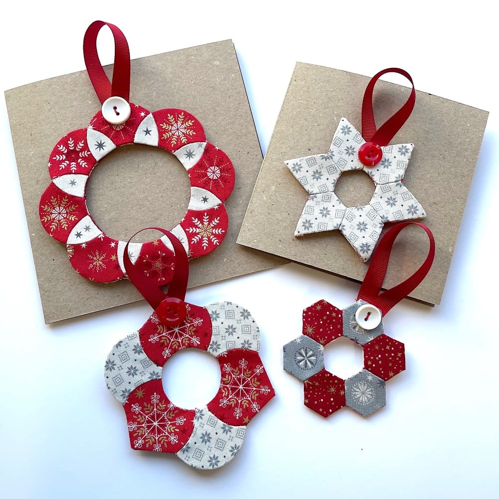 Use Louisa's favourite hand sewing technique of curved English paper-piecing to make these cute festive rings which you can use to decorate your tree, or attach to a greetings card to send to a loved one for them to detach and hang on their tree. They can then be used year after year.