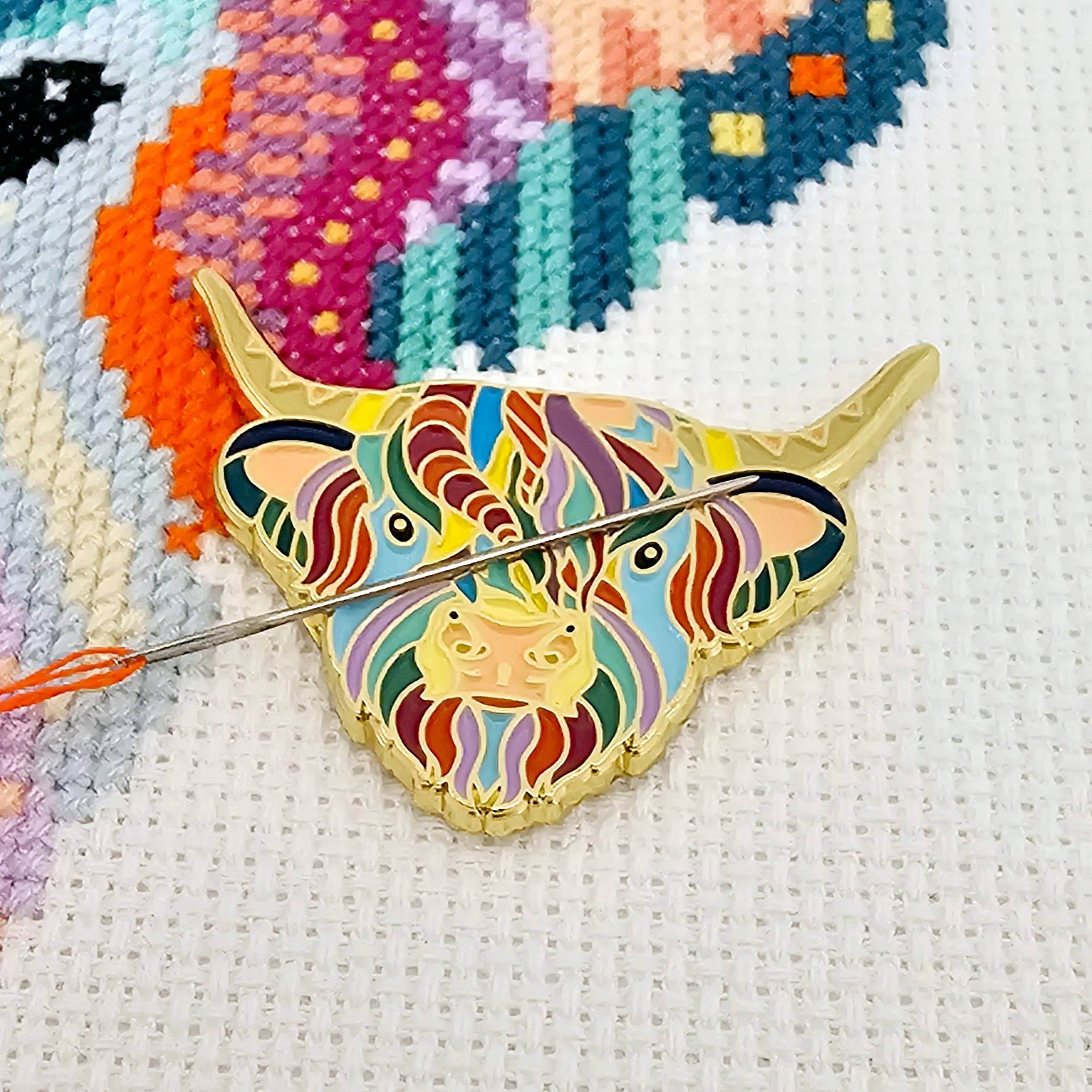 Rest your sewing needle on the horns of this beautiful Highland Cow - made up of wonderfully bright colours. You definitely won't lose this No longer will you have to put your needle through your sleeve or in between your teeth. And no more worrying about dropping needles on the floor or down the side of the sofa! With our needle minder, you will be able to keep your needle securely in one place and not have to worry about losing it again.
